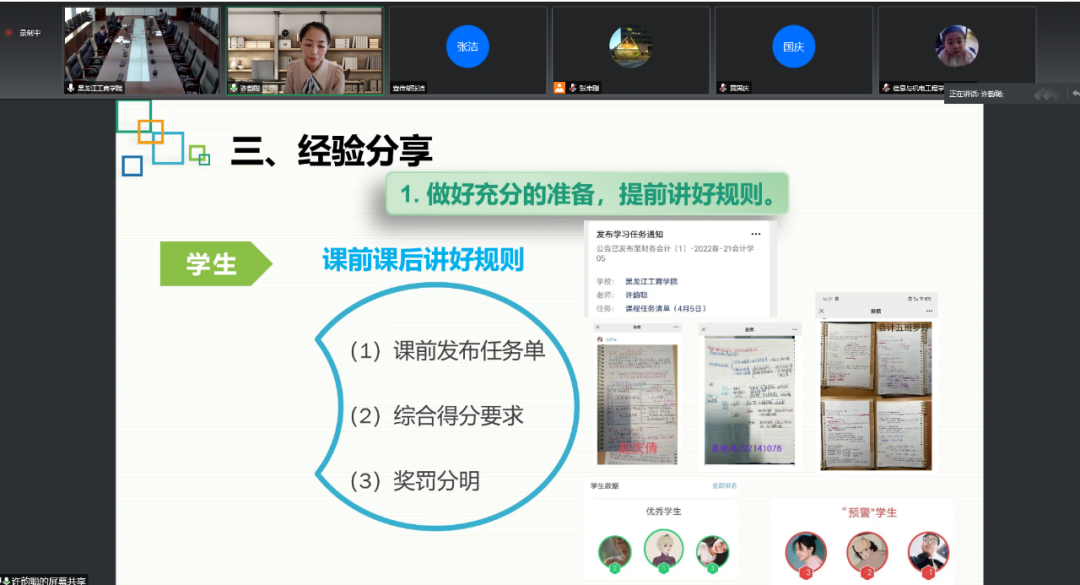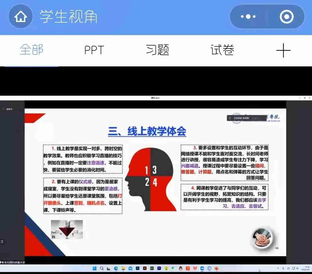 4月6日下午,学校“云端”召开春季学期线上教学经验交流会,总结3月以来线上教学工作经验典型和存在问题,分别面向二级学院(教学部)之间、不同专业教师之间、不同年级学生之间开展教与学心得体会交流,传达学习《教育部等五部门关于加强普通高等学校在线开放课程教学管理的若干意见》,全方位保障在线教学质量,推进在线学习与线下课堂教学质量实质等效。