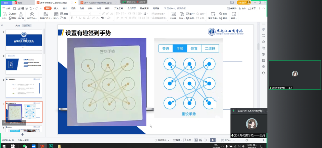 艺术与传媒学院王丹从基于OBE理念的角度,从学生认知规律入手,畅谈了如何实现有效的课堂弹幕互动、合理设置安排课程作业、开展网络研讨呈现优质作品。