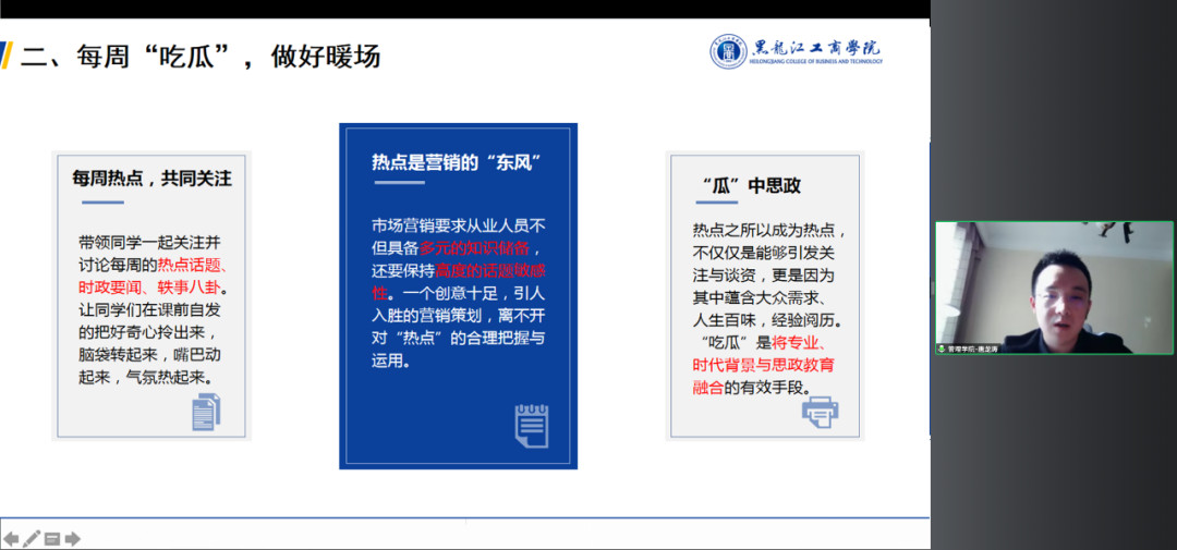 如何让“教”与“学”在线上碰撞出思想共鸣的火花,如何做到课堂热情洋溢、有序有趣,到课率100%,管理学院教师唐龙涛结合《营销策划》教学心得,给出了自己的答案:“一起‘吃瓜’,做好暖场;启发引导,抛砖引玉;互动反馈,项目要做;课程思政,潜移默化。”