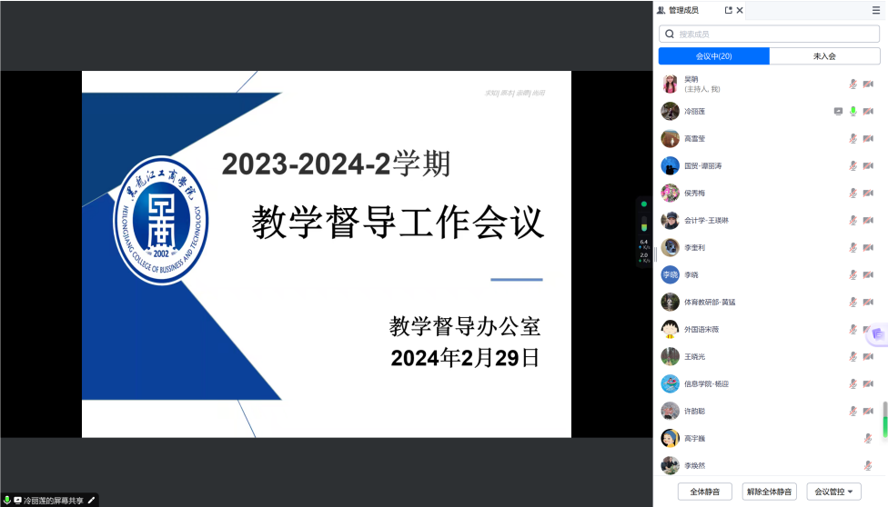 为进一步加强和改进学校教学督导工作,更好的发挥教学督导在教学质量保障体系中的作用。2月29日晚上,教学质量监控与评估中心在线上召开了教学督导工作会议,督导室主任冷丽莲主持会议,教学督导组全体人员参加会议。