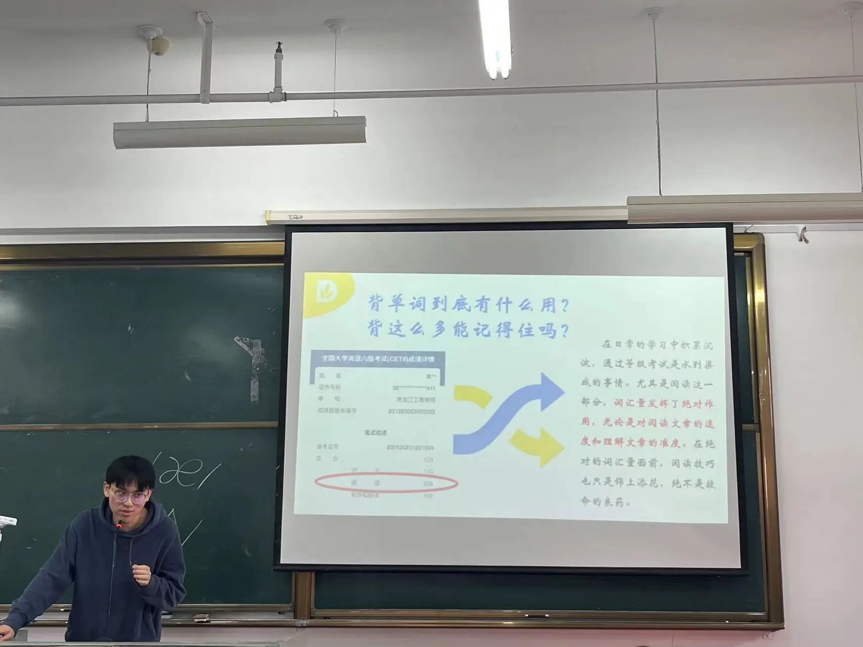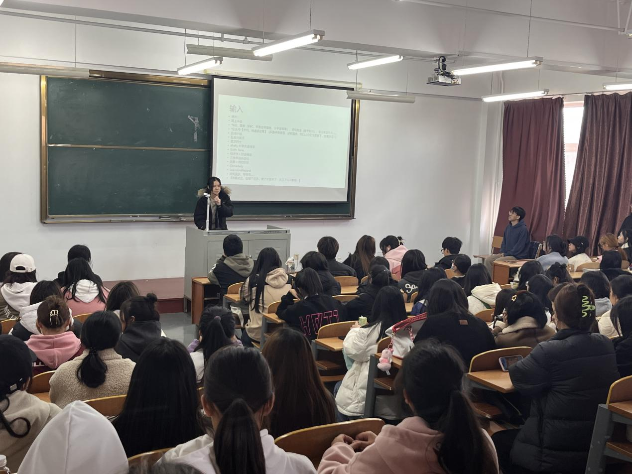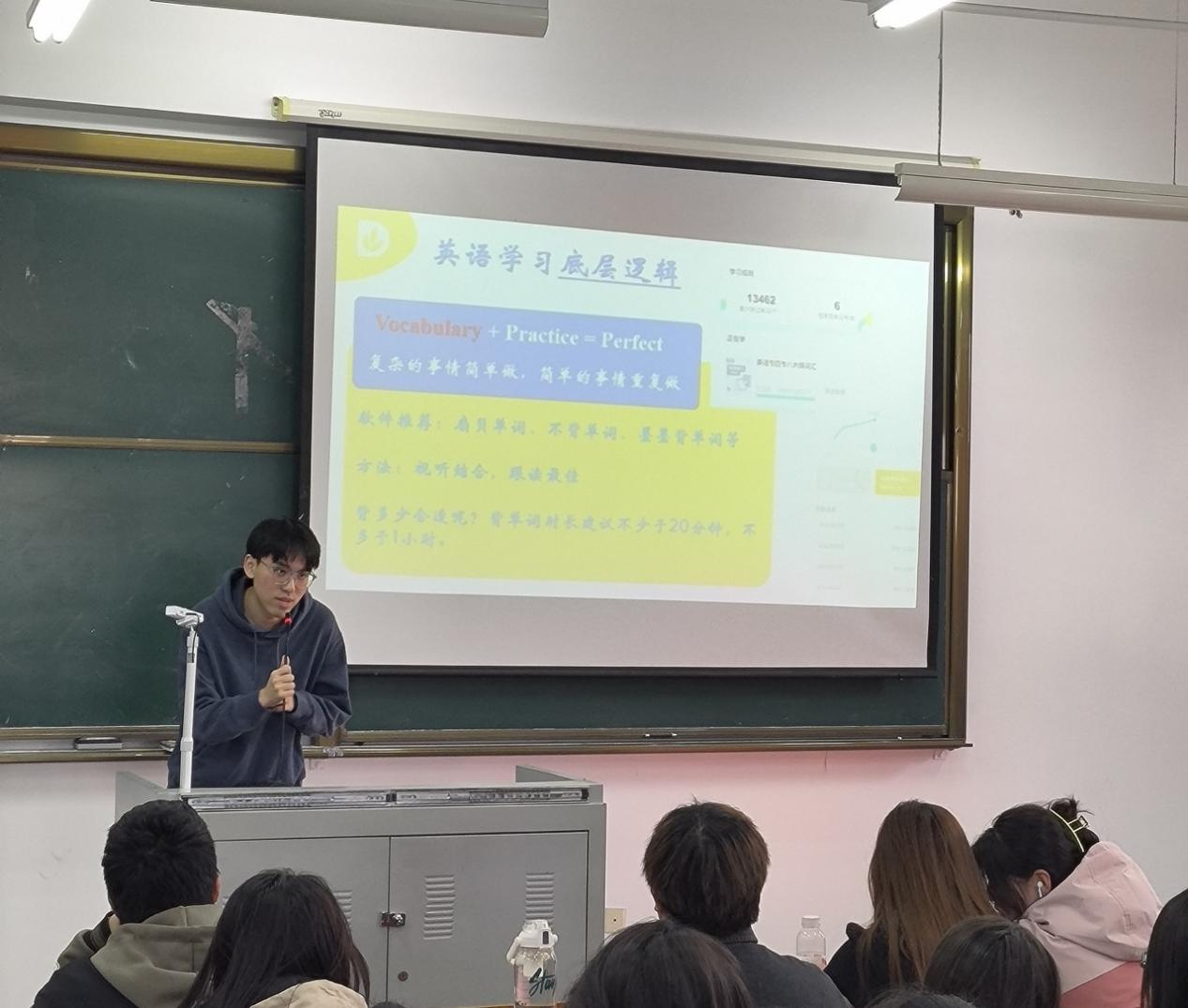 2021级单柏侨同学则从听、说、读、写、译五个方面进行了备考经验和英语学习技巧的分享。以自己的亲身经历来向同学们阐述学习英语的重要性,用英语学习底层逻辑的方式讲述如何学习并学好英语、如何提高英语。通过讲述、总结自身的学习经历和学习技巧为学弟学妹们提供更好的学习方法。同时告诫大家要虚心请教,求取知识,要注重英语逻辑,特别是在口语、听力、词汇等方面进行的提升。
