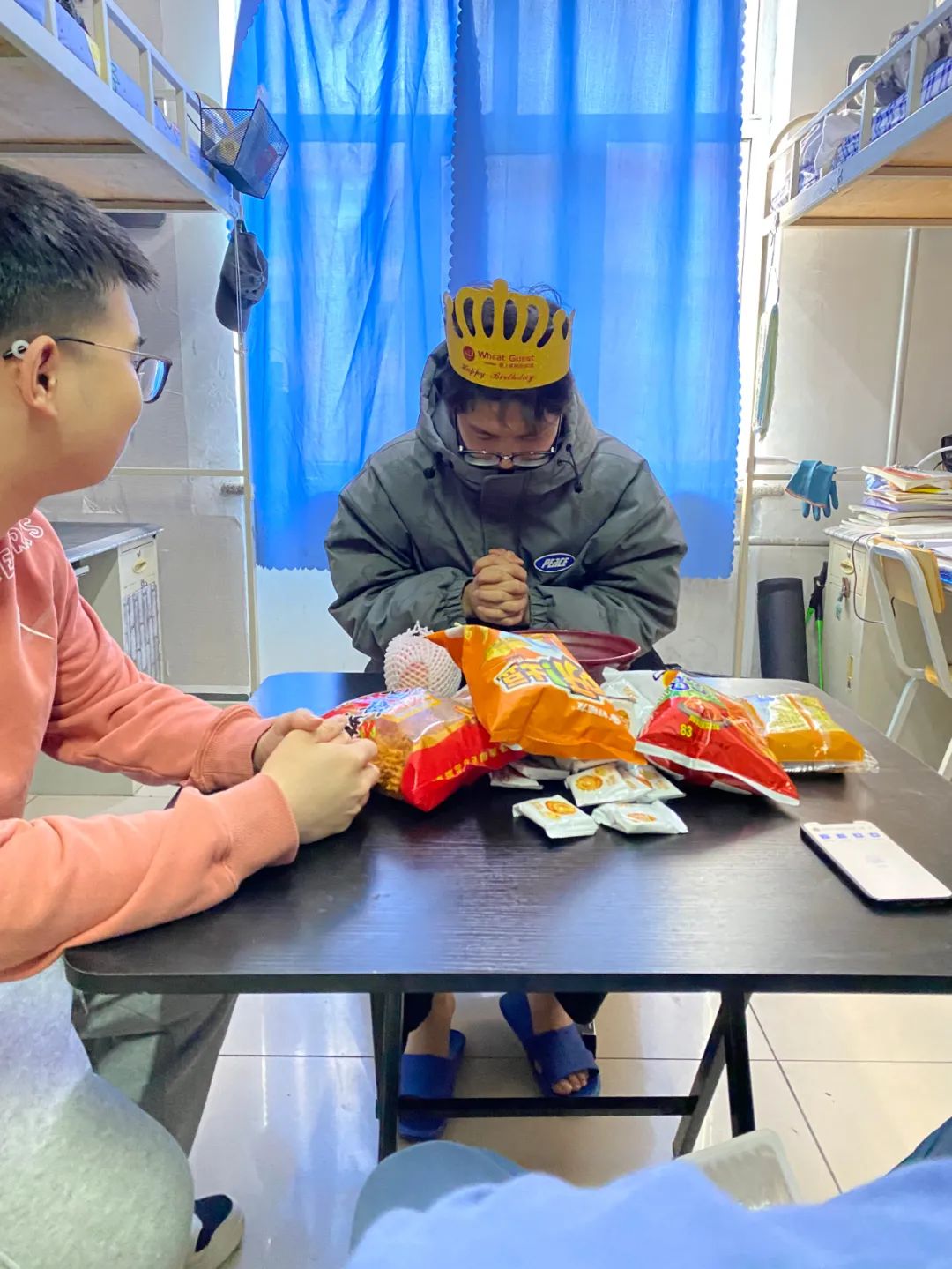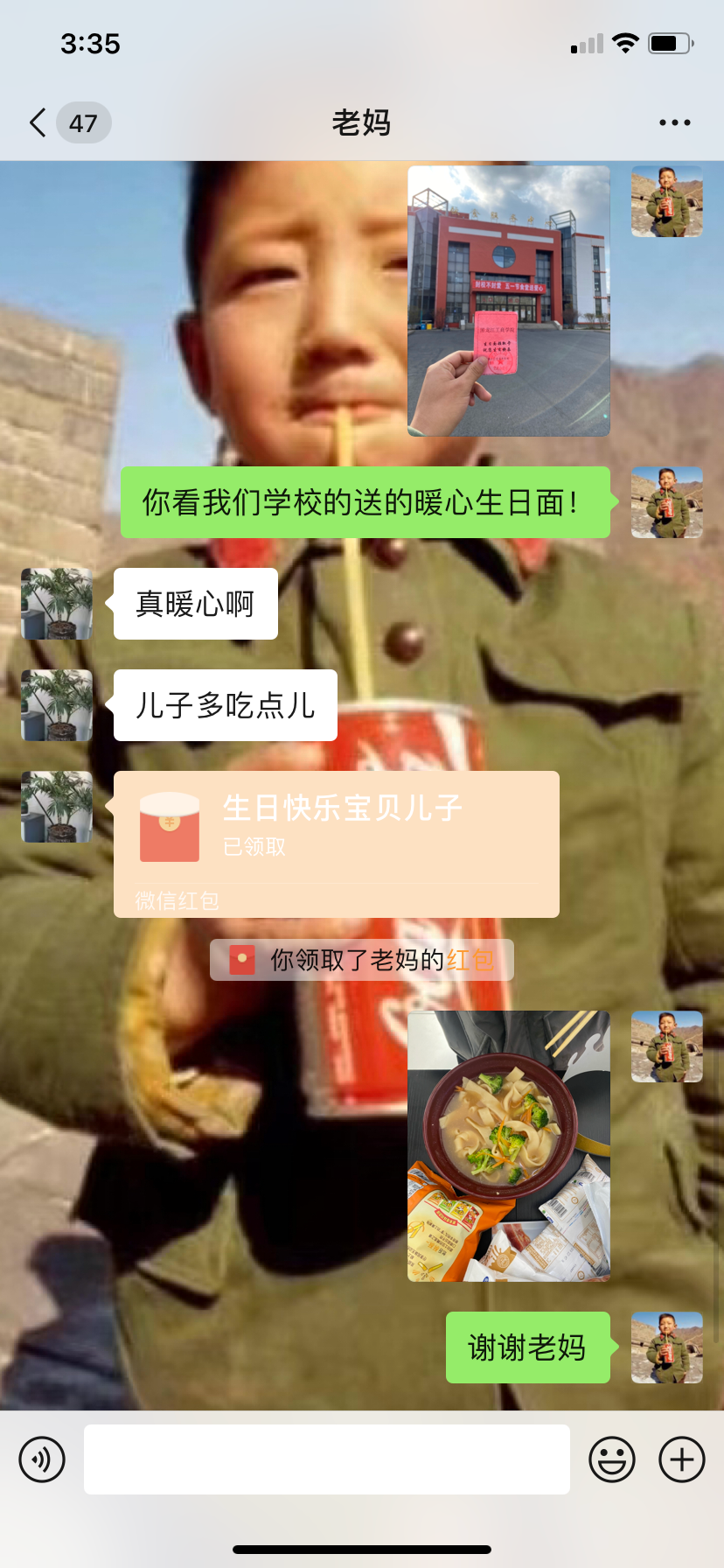 “今年的生日很特别,今年的‘五一’也很特别,虽然还是封闭在校园里,但学校为我准备了一碗生日面,并送上美好的祝福,辅导员老师亲自送到我寝室的,还给我带了一块小蛋糕,太有爱了。”2020级电子信息工程专业的李冰同学兴奋的在朋友圈分享着生日“见闻”。