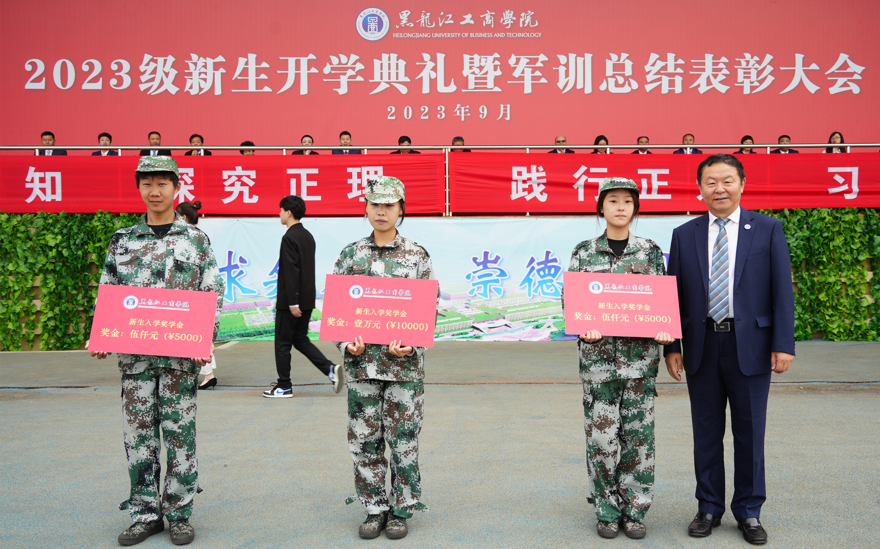 注:校长秦智伟为新生入学奖获得者颁奖
