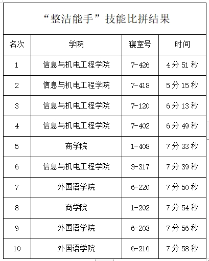 此次“整洁能手”技能比拼,不仅是对同学们生活技能的一次检验,更是对寝室文化的一次深度挖掘。我们希望通过这次活动,让同学们更加珍惜寝室生活,培养良好的生活习惯和团队合作精神。同时,我们也期待看到同学们在比赛中展现出独特的创意和才华,共同为寝室文化节增添一抹亮丽的色彩。