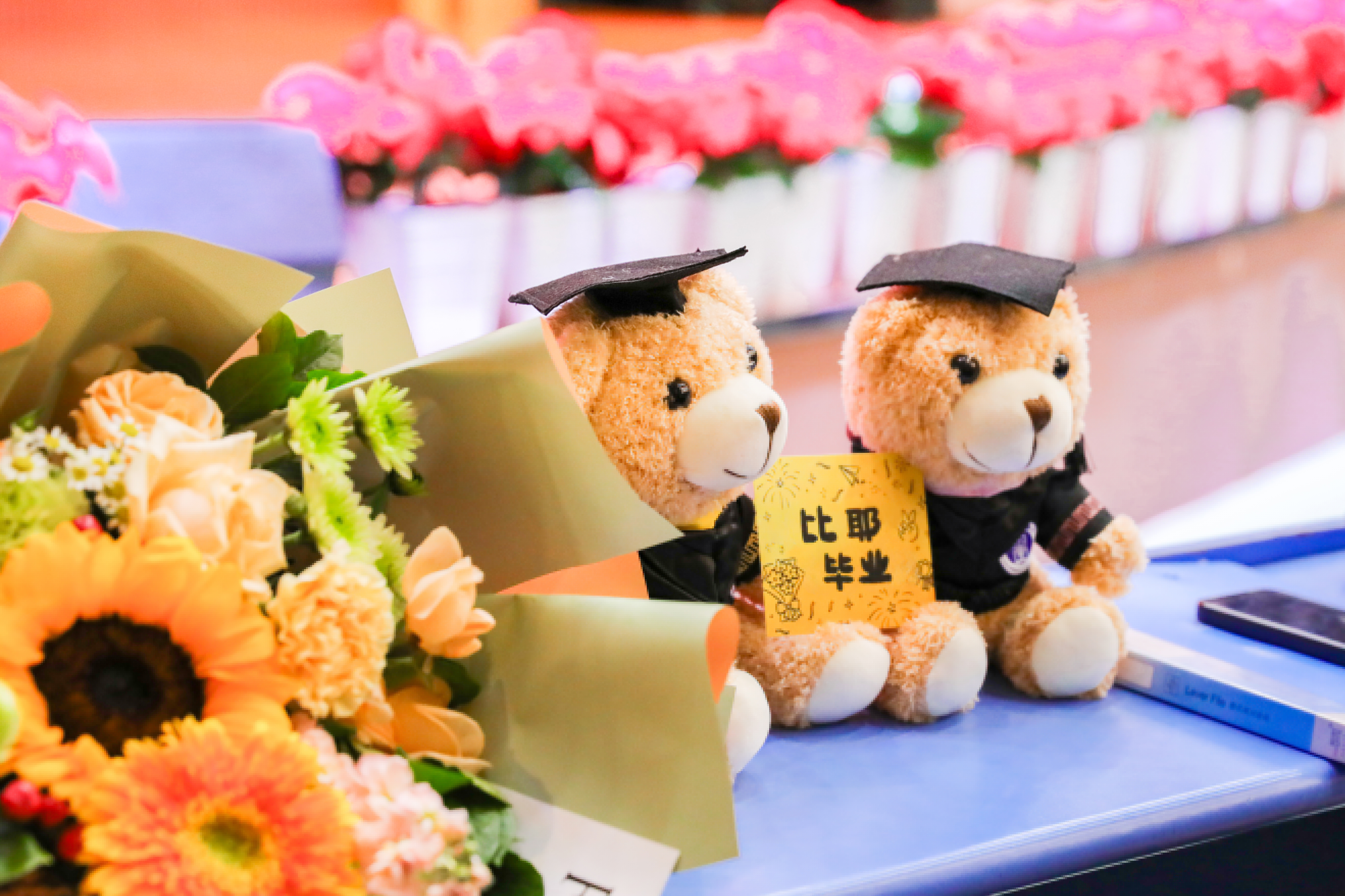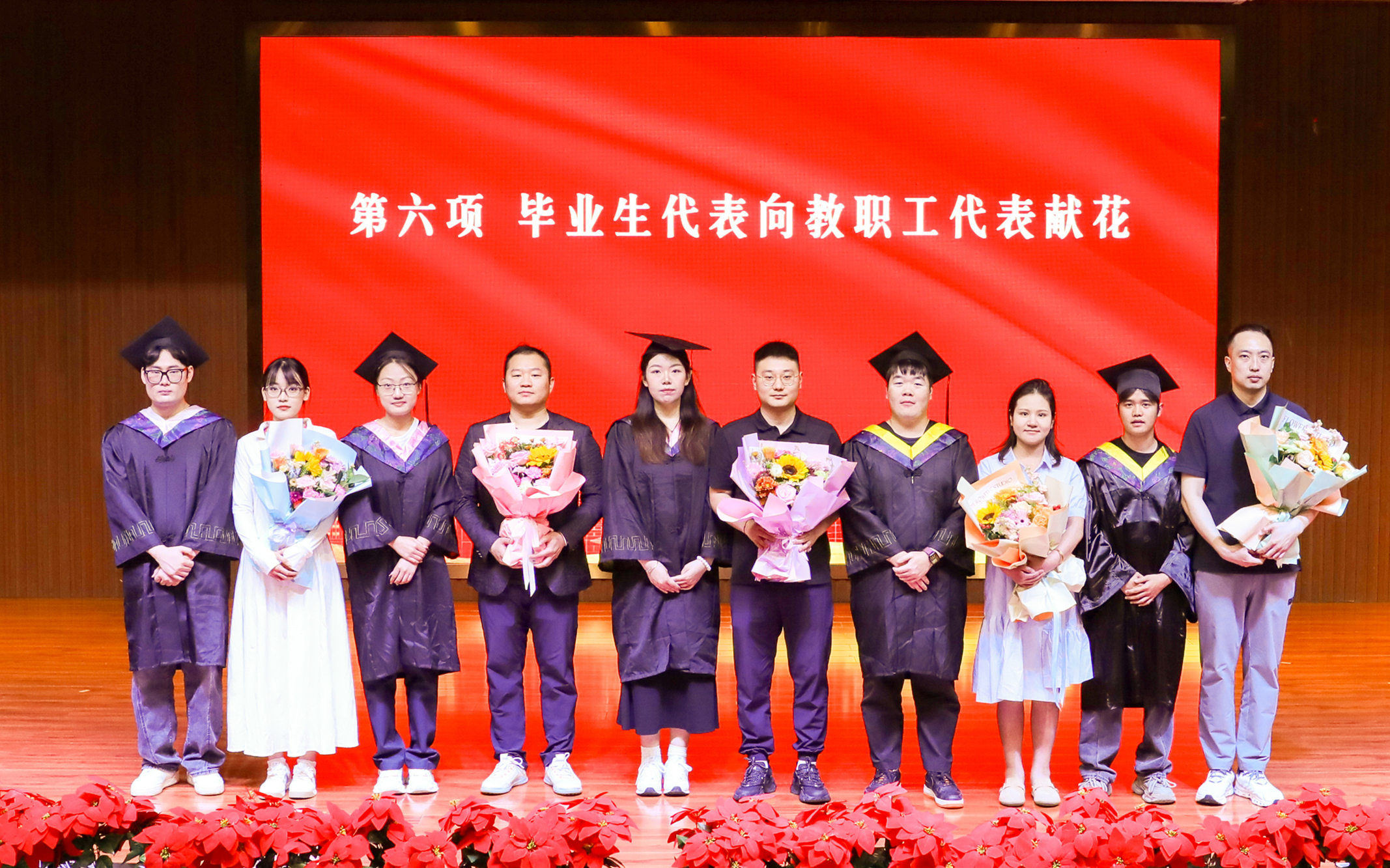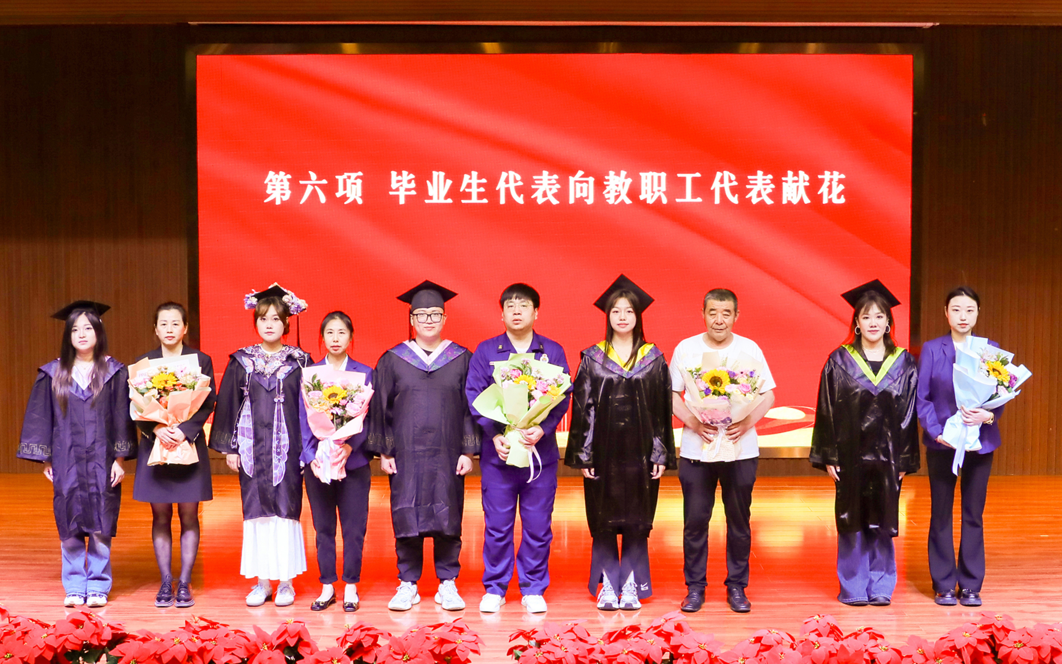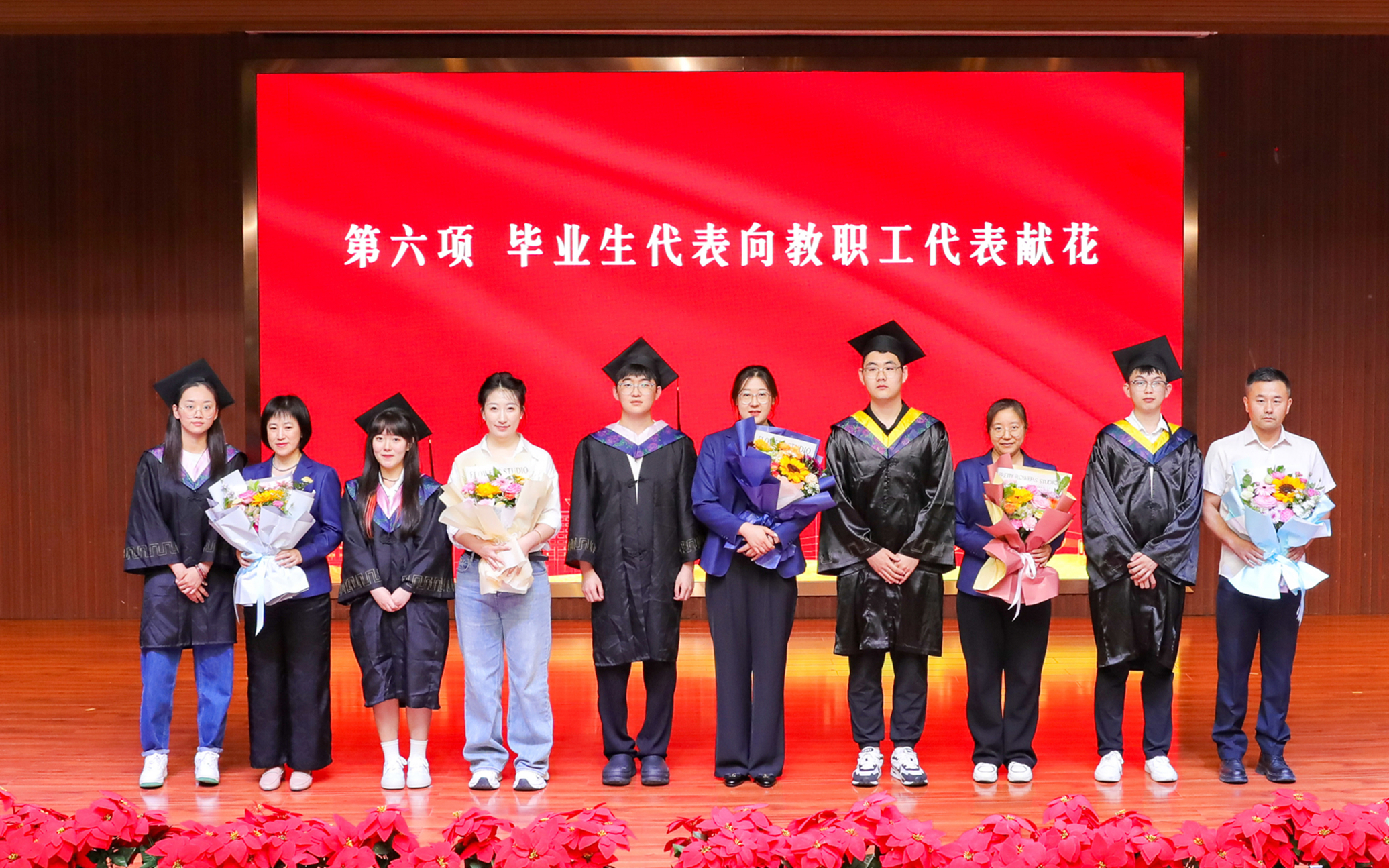 注:毕业生代表向四年来辛勤付出的教职工代表献花,表达感激之情