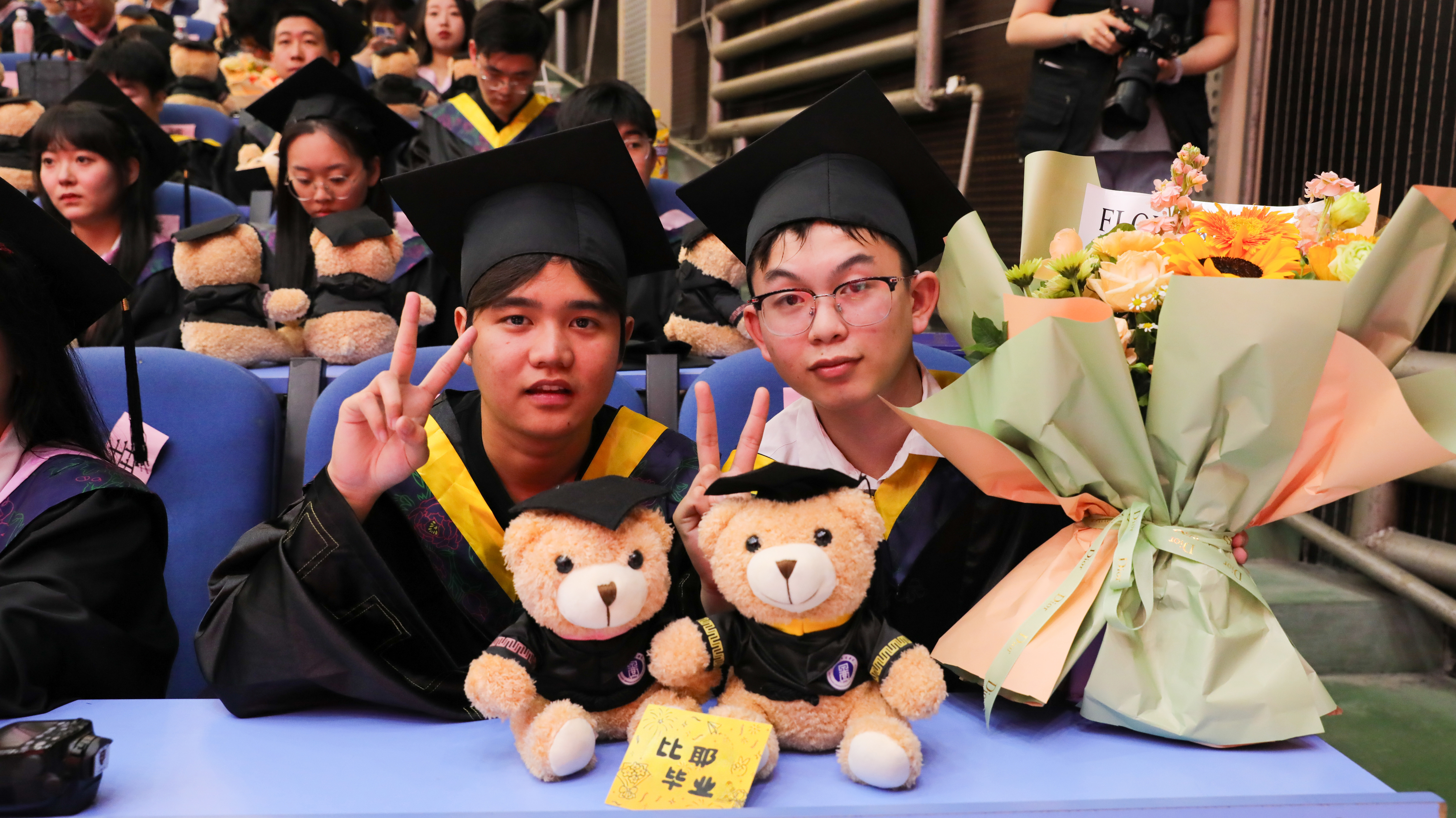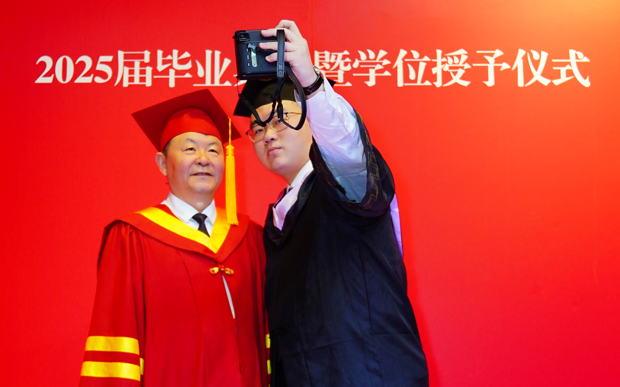 在最庄严神圣的学位授予仪式上,毕业生们身着学位服,依次登上主席台。校长秦智伟与副校长、学位评定委员会副主任委员孙智慧为他们逐一扶正流苏、颁发学位证书,并亲切合影留念。帽穗从右侧拨至左侧,“扶正流苏”象征着学有所成,展翅高飞。这简短而神圣的仪式,标志着大学生活的圆满落幕,也预示着崭新人生阶段的正式开启。