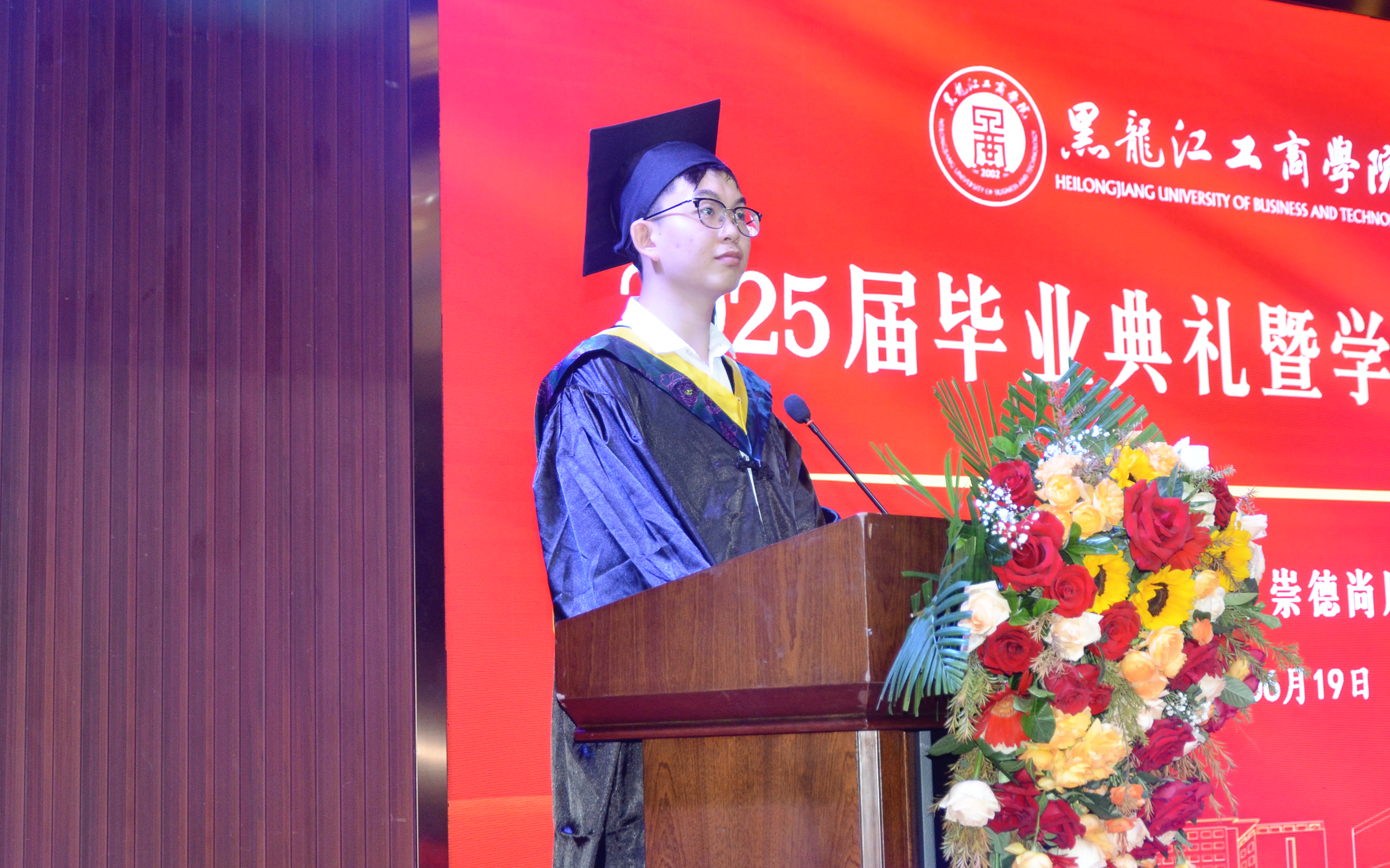 毕业生代表、软件工程专业的吴光垚同学回顾了大学四年从懵懂到成熟的蜕变,由衷感谢母校赋予的独立思考能力、自强不息品格和直面风雨的勇气。他代表全体毕业生庄严承诺,将怀“天生我才”之自信,秉“乘风破浪”之勇气,光耀母校之名,勇担时代之任,让青春在奉献中绽放绚丽光彩。