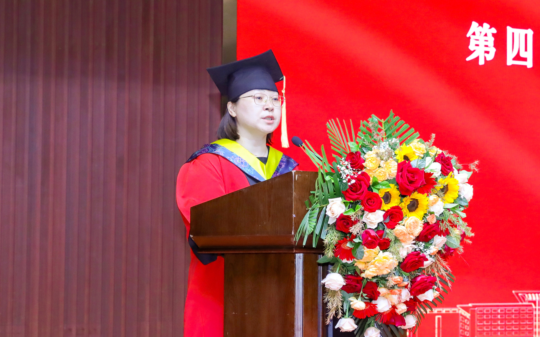 教师代表、外国语学院马海欧教授为毕业生们送上殷切嘱托。她勉励大家:以“求知”为楫,在社会的广阔江海中破浪前行;以“担当”为墨,在民族复兴的画卷上书写华章;以“创新”为翼,在未来的天空中翱翔,将无数“不可能”变为“中国奇迹”。