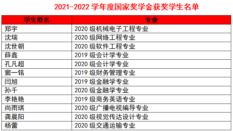 青春孕育无限希望,青春创造美好明天。日前,教育部发布《关于2021-2022学年度本专科国家奖学金获奖学生名单的公告》,我校郑宇等12名同学榜上有名。