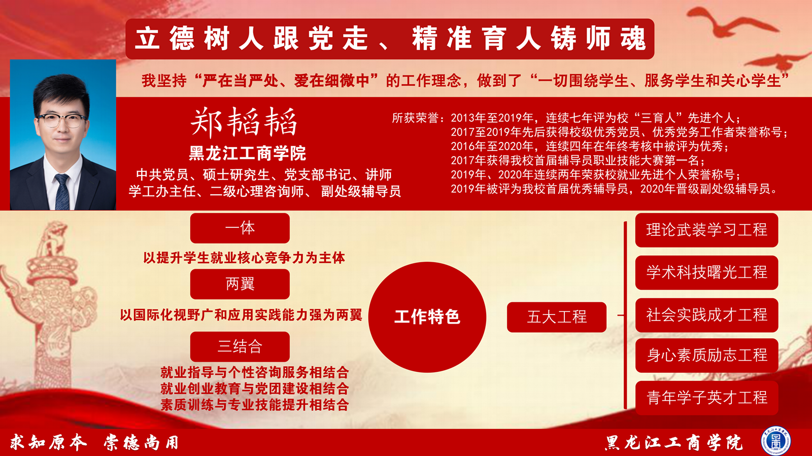 郑韬韬,男,汉族,中共党员,研究生,副处级辅导员,现任经济与贸易学院学工办主任。他带着12年来对辅导员的理解与坚守,参加了第十三届全省高校辅导员年度人物评选,通过材料外审、述职答辩比赛等环节,最终获得十三届黑龙江省高校辅导员年度人物提名奖。12个春秋,45个班级,1502名学生,郑韬韬做到了“一切围绕学生、服务学生和关心学生”,坚持把立德树人根本任务和思想政治工作贯穿于学生的四年教育管理服务的全过程,实现了第一课堂与第二课堂协调育人的有机统一,通过多年的工作经验,他总结形成了“一体二翼三结合”的工作特色,着力打造“五大工程”,全面提升了大学生的综合素质和就业核心竞争力。郑韬韬所带的学生党支部于2021年被评为省委教育工委“先进基层党组织”,他连续两年被评为学校就业先进个人、“校首届辅导员职业技能大赛第一名”、首届“优秀辅导员”荣誉称号,多次获得校级“优秀党员、优秀党务工作者”等荣誉称号,用自己的实际行动展示了一名高校辅导员的勤恳敬业和无私奉献精神。