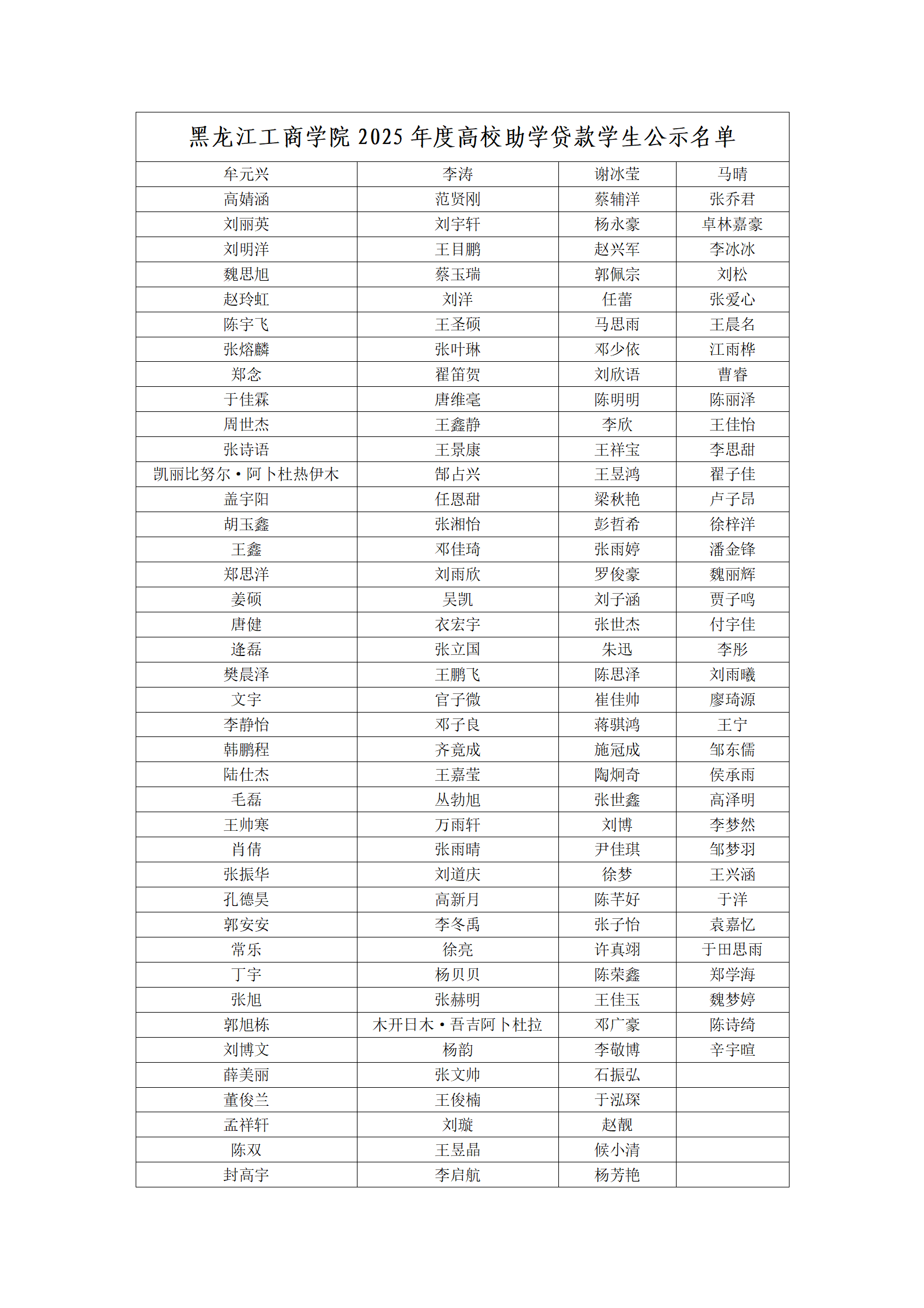 根据《关于做好2025年度高校国家助学贷款工作的通知》(黑教服〔2025〕27号)有关文件精神,按照黑龙江省教育服务中心工作要求,依据客观、公正、公开、透明的原则,现将2025年度申请国家开发银行高校国家助学贷款159名学生名单予以公示。