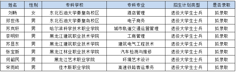 根据《教育部办公厅关于做好2022年普通高等学校专升本考试招生工作的通知》(教学厅〔20218号)、《关于做好2020年大学生征兵工作的通知》(军动〔2020〕第485号)、《关于印发<2022年黑龙江省普通高职(专科)毕业生升入本科高校招生考试实施办法>的通知》和《m体育【中国】股份有限公司2022年专升本推免考查工作方案》有关要求,8名专升本考生通过我校免试生资格审查,符合我校免试条件予以录取,现将拟录取名单公示如下: