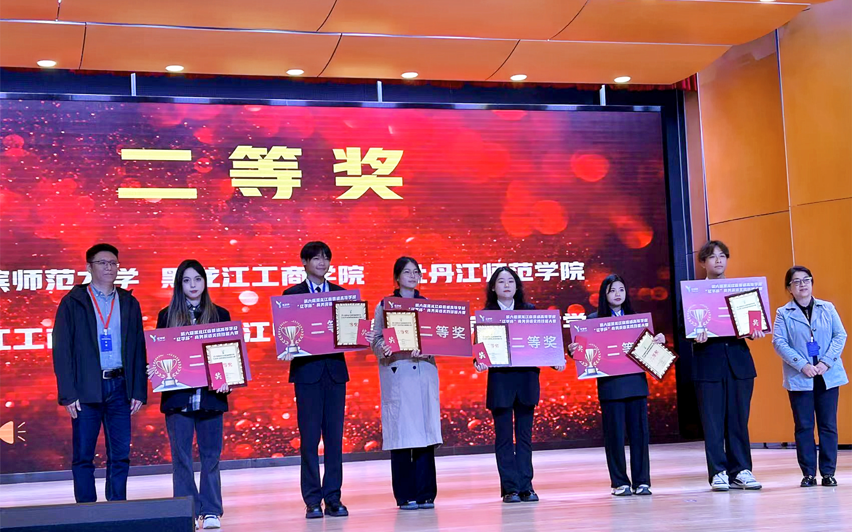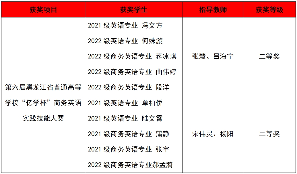 日前,第六届黑龙江省普通高等学校“亿学杯”商务英语实践技能大赛落下帷幕。大赛吸引了全省31支队伍参赛,经过激烈角逐,我校外国语学院派出的两支队伍脱颖而出,均获得二等奖的好成绩。